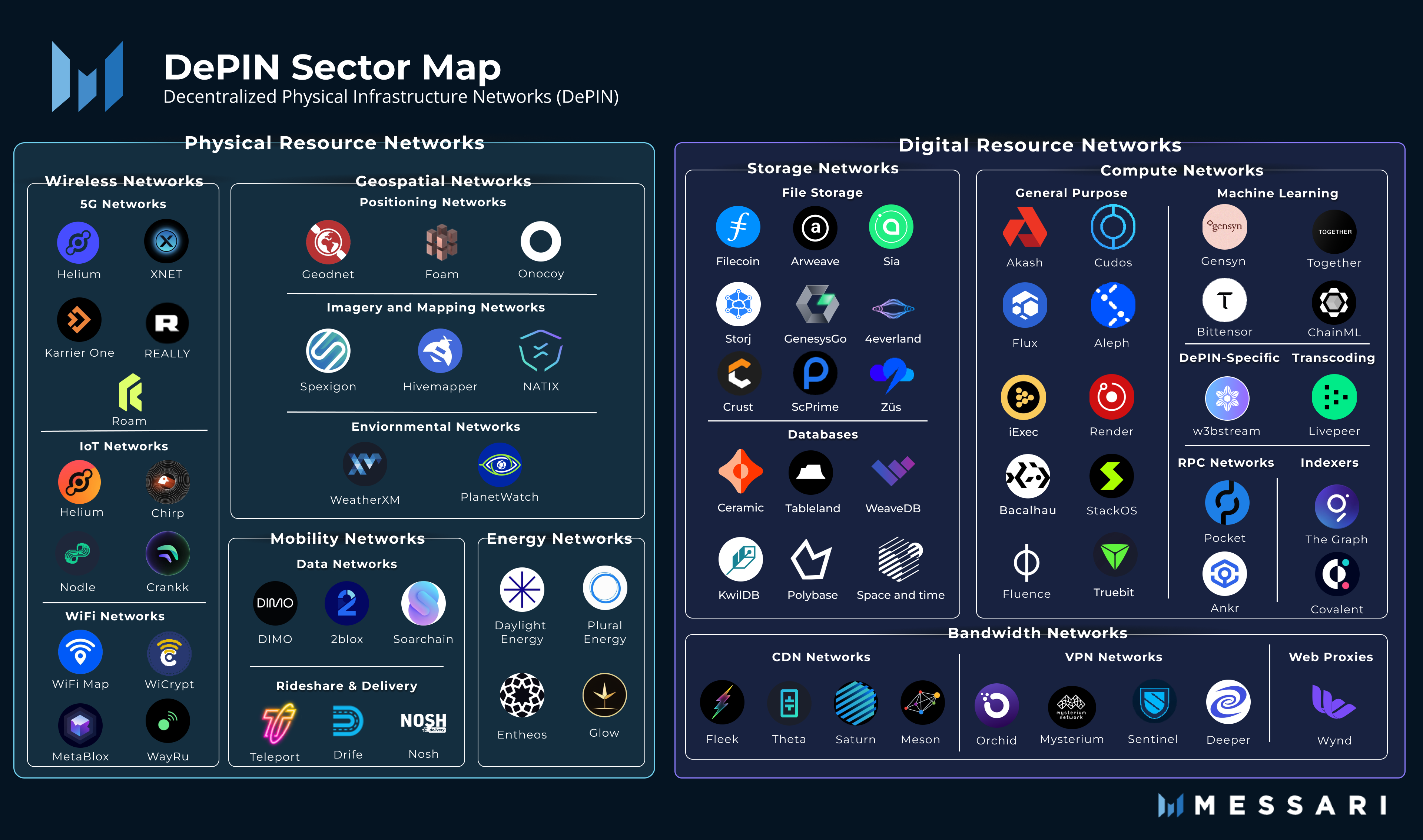 on the DePIN Sector, PRNs and DRNs are “characterized by the hardware, resources, goods, and services they offer.” The DePIN Sector Map below is an image pulled from Messari’s DePIN Report that classifies projects into PRNs & DRNS and furthermore into buckets based on their use cases.DISCLAIMER : The Messari DePIN report (and the image below) are from 2023 and a year is a lot in the blockchain space. While most of these projects still exist with some of them thriving more than ever, some of them might have shut down or pivoted.